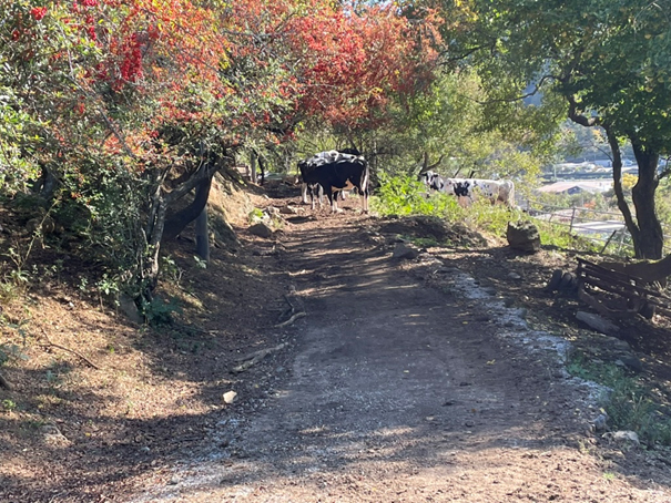 斎藤牧場は25haの山地で放牧を主体にした経営で、放牧以外では、「地域副産物を飼料化して循環利用する」飼料給与を行なっています。具体的には、タケノコ皮、千枚漬けカブ残渣、酒粕、米ぬか、ビール粕など、地域食品産業の副産物をサイレージ化・保管し、放牧草と組み合わせて給与。購入飼料は「ふすま」が中心で、配合飼料やトウモロコシが僅かです。こうした持続可能な経営の先進性が評価され、農水省「みどりの食料システム戦略」部門で最優秀賞を(2025年度)されました。 牛群は急斜面環境に適応するよう中小型(400~500kg)で構成され、自然交配での繁殖が基本です。搾乳牛25頭規模で、日量約200kg、年間乳量は1頭あたり約5,000kgが目安です。急斜面では700kg以上の大型牛は事故リスクが高まるため、繁殖・淘汰方針も「山地適応性」を重視しています。繁殖後の子牛は転倒リスクを避けるため一度牛舎に移し、安全を確保してから段階的に放牧へ移行されています。 季節に応じて副産物の投入が変動し、秋から冬にはカブ残渣、11月からはタケノコ皮サイレージを中心です。高温期には日中採食が落ち込むため、朝夕採食を促し、酒粕で嗜好性を高める工夫がされています。課題は、夏季の草刈り負荷、高温ストレス、急傾斜固有の事故リスク、低温殺菌委託先の負荷などだそうです。 生乳はひまわり乳業で「牛乳」に製品化され、販売は斉藤牧場の「山愛会」など消費者団体による支援が中心です。地域循環と山地酪農の価値が消費者側に支持され経営が成立していることが特徴です。 ![]() ![]() ![]()